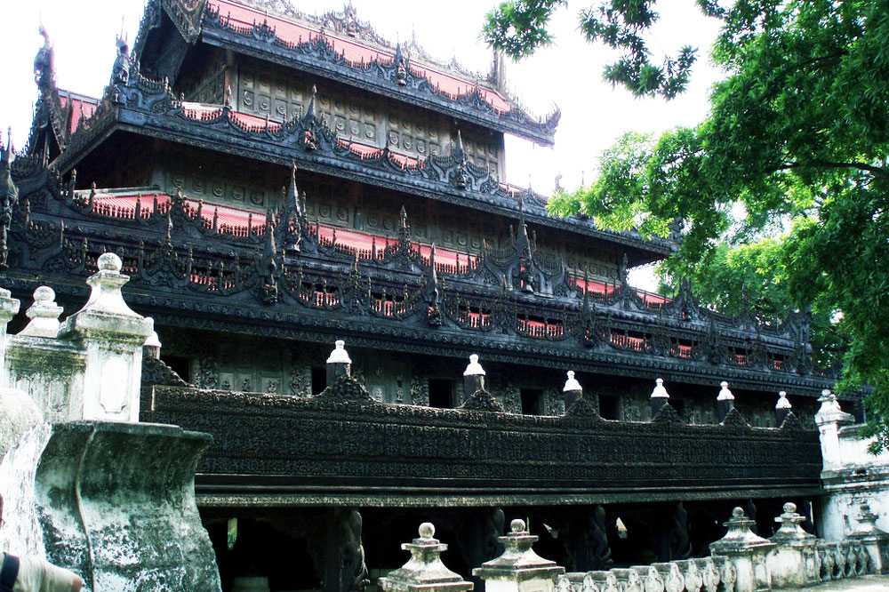 Tu viện này là một ví dụ điển hình tuyệt vời lớn của thế kỷ 19 với kiến trúc bằng gỗ tếch và cũng là một kiệt tác quan trọng của nghệ thuật khắc gỗ phức tạp từ thần thoại Phật giáo độc đáo. Được xây dựng như một phần của cung điện hoàng gia Amarapura bởi nghệ nhân dưới thời vua Mindon, ngôi nhà hoàng gia này được bọc trong lá và thủy tinh khảm vàng nhưng bị tháo dỡ vào năm 1857 và vận chuyển đến các cung điện tại Mandalay. Khi cha vua qua đời tại ngôi nhà, vua sợ bị ám ảnh bởi những linh hồn xấu xa, vì vậy ông đã cho tháo gỡ nó một lần nữa trong năm 1879 và tái tạo cấu trúc bằng gỗ tếch. Ngày nay, Shwenandaw là một tu viện, nhưng không có tu sĩ thực sự sống trong tòa nhà đẹp này. Nơi đây đã trở thành một điểm thu hút phổ biến khách du lịch, nhiếp ảnh gia.